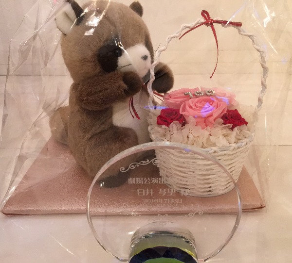 写真はことレボのみなさんから公演100回記念のクリスタル盾とブリザーブドフラワーとるかぽんをいただきました(o^^o)